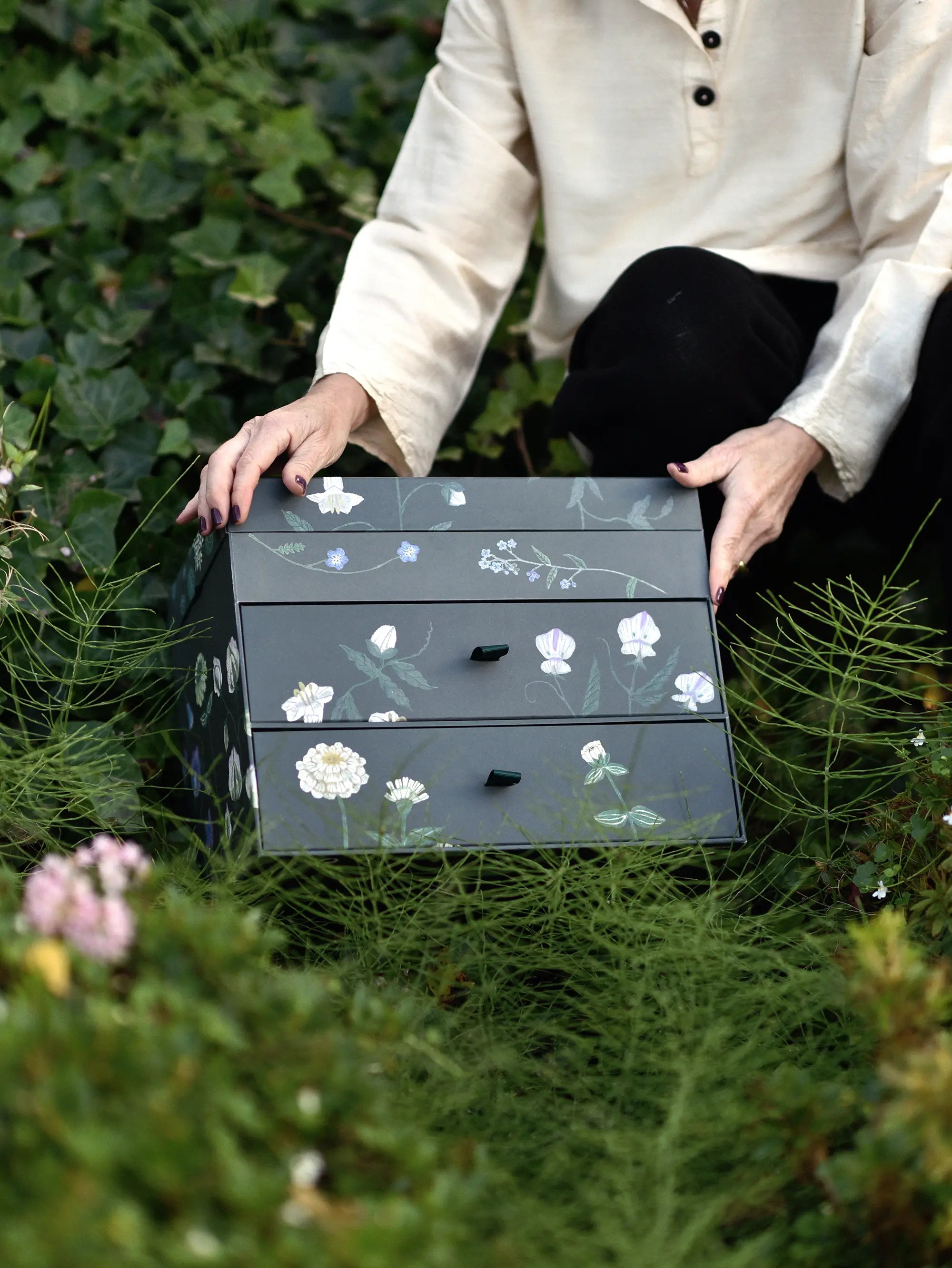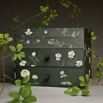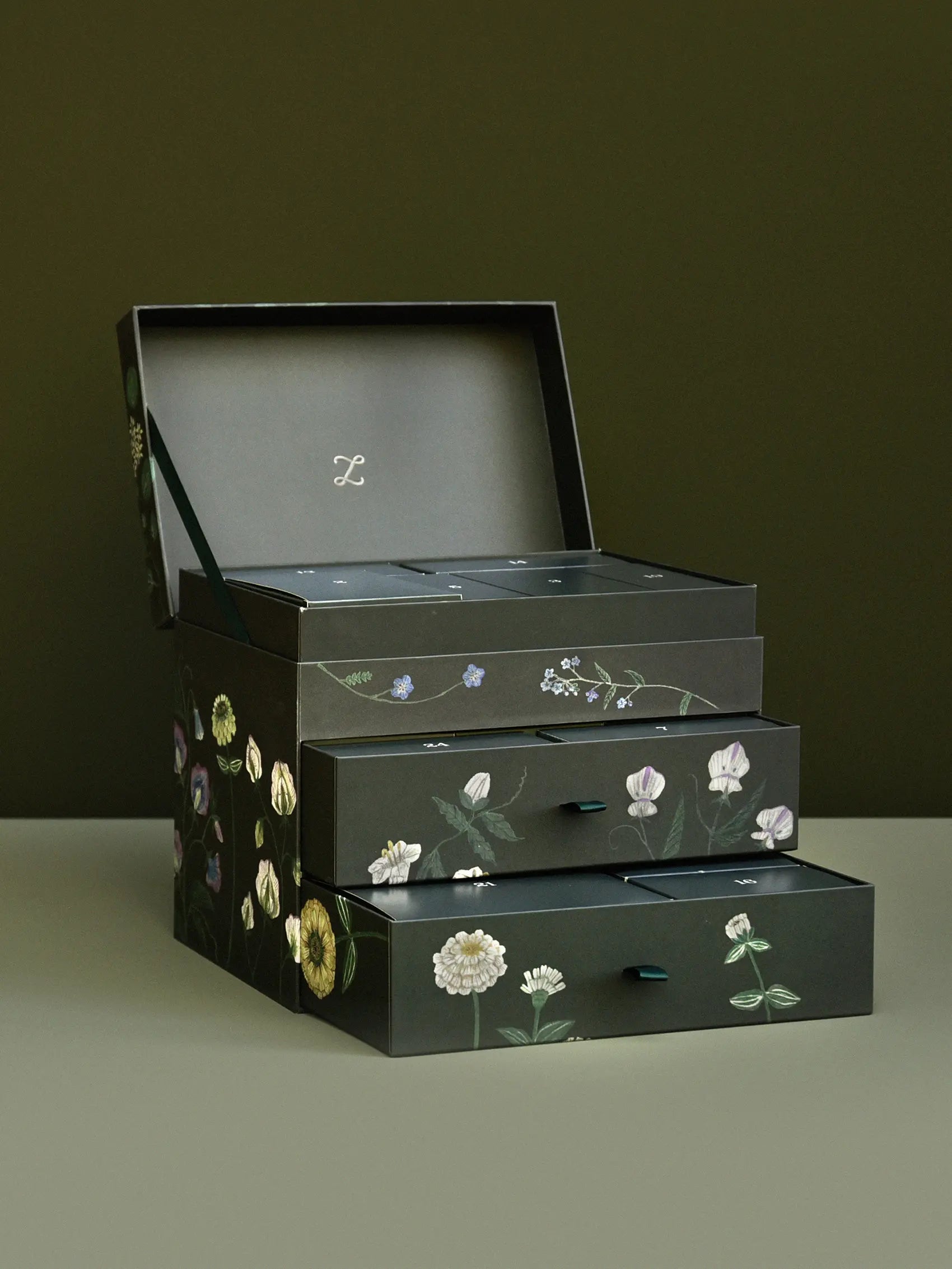 A calendar that is both practical for storing things – and so elegant and refined that you’ll want to keep it on display all year round. At home, in the greenhouse, or in the garden shed. In moss-green tones and dressed in a pattern of cup-and-saucer vine, sweet pea, and forget-me-not.