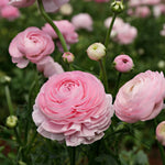 Ranunculus Pink has pink densely filled flowers. Beautiful together in a bouquet with the pink rose core 'Cupcake Blush' and the flower carrot 'Dara'.