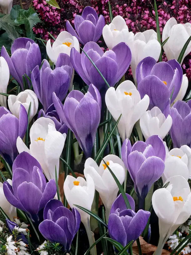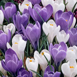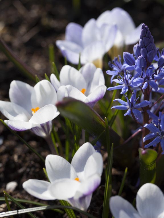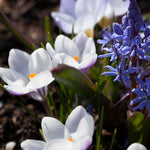 Hybrid crocus 'Blue Ice' is a mix of blue and white crocuses. The flowers provide a welcome source of nourishment for awakening bees and bumblebees in March–April. Plant in groups in sparse lawns, rock gardens, or beneath shrubs and trees.