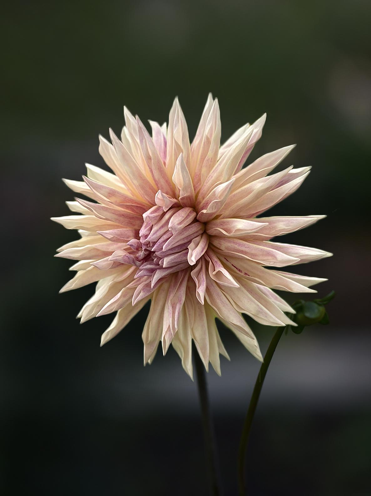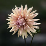 Dahlia 'Café de Paris' features romantic, slightly ruffled flowers in soft shades ranging from cream white to light old pink with a hint of lavender. The flower heads are large, about 15–20 cm, with the typical appearance of cactus dahlias, characterized by long, gently rolled petals. It is richly blooming and wonderful as a cut flower.