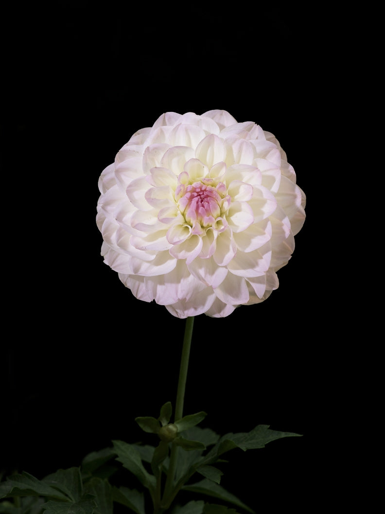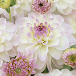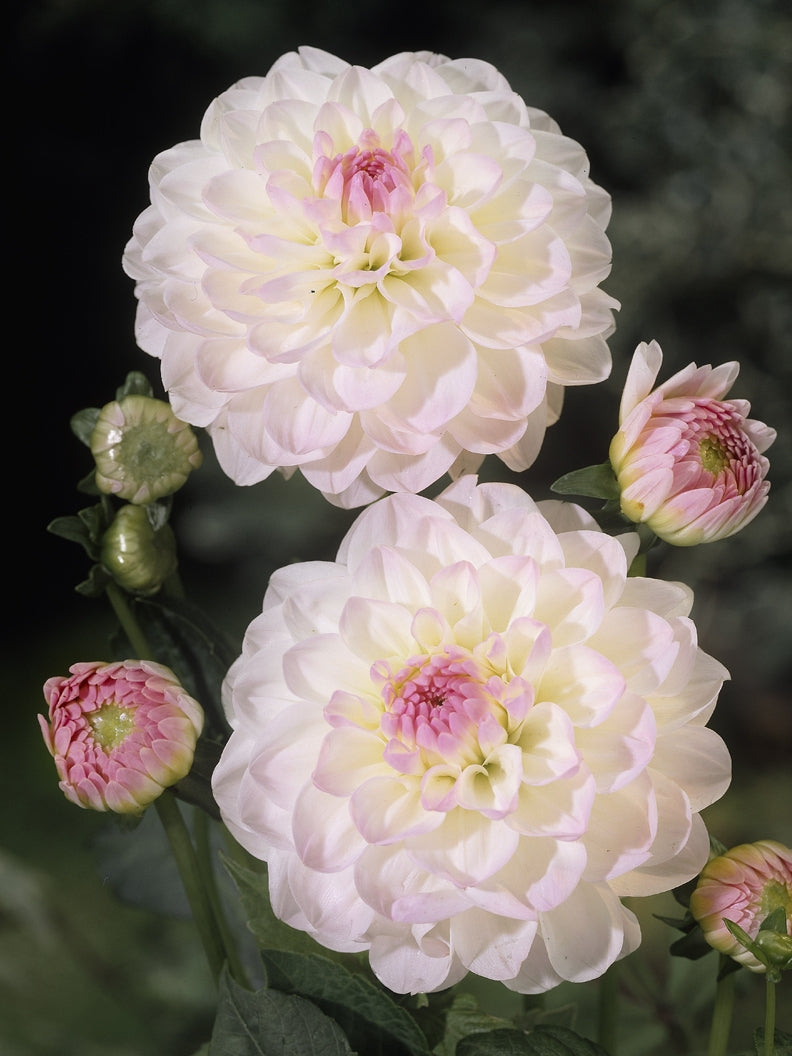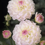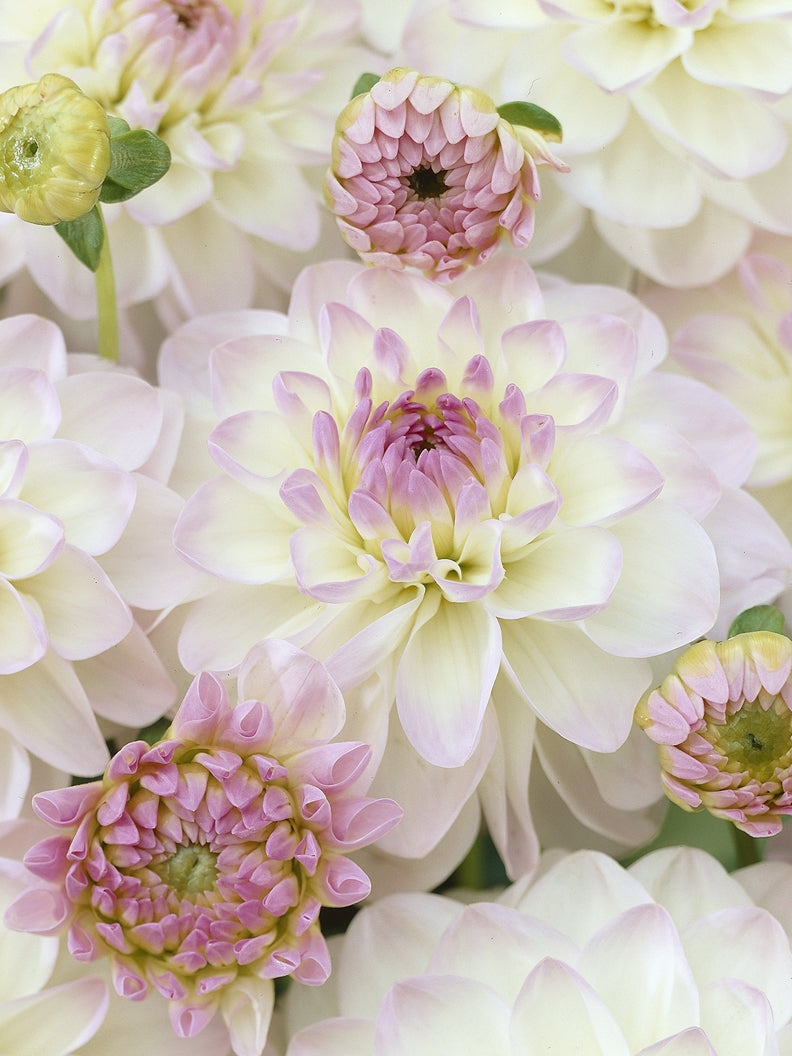 Dahlia 'Eveline' is a delightful variety that fits beautifully into a romantic garden. White flowers with a light violet center. The tips of the petals share the same violet hue. Excellent as a cut flower due to its long stems.