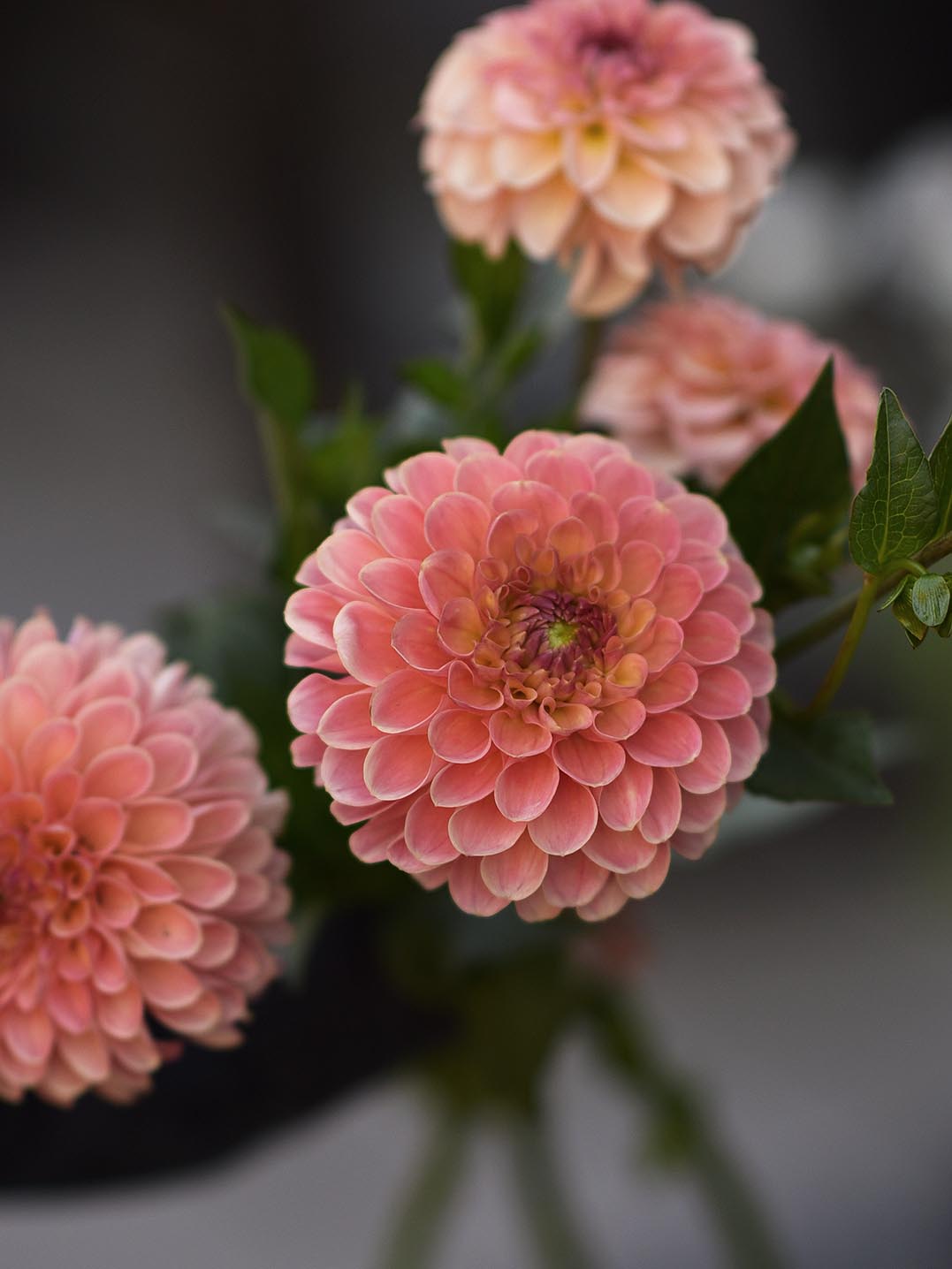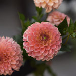 Dahlia 'Jowey Nicky' is a majestic pompon dahlia with perfectly shaped blooms that captivate with their exquisite blend of soft salmon-pink and apricot-yellow hues. The ball-shaped flowers measure approximately 10 cm in diameter, featuring neatly rolled petals. This variety is stunning when mixed in plantings and bouquets alongside more free-flowing dahlias and other plants with a wilder appearance.