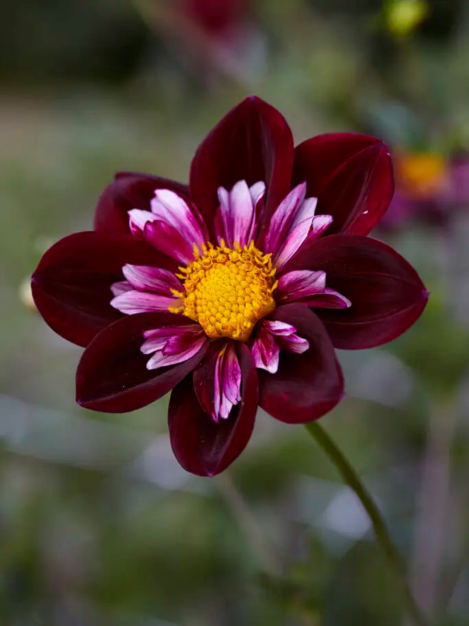 Dahlia ‘Joyful Investment’ is an award-winning and exceptionally beautiful dahlia. The flowers feature dark crimson petals, a charming white and pink central frill, and a warm yellow centre. The elegant blooms contrast beautifully with the green foliage, creating an eye-catching display in the garden. Blooms generously and is perfect for cutting.