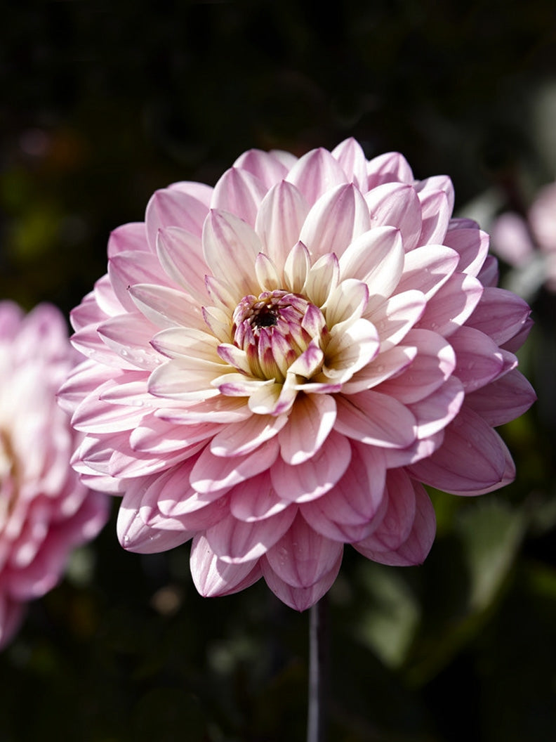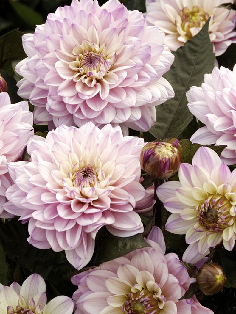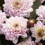 Dahlia ‘Gallery La Tour’ is a magnificent dahlia for those who love pink. The flowers are full with a light yellow center, and the leaves and stems have a dark tone.