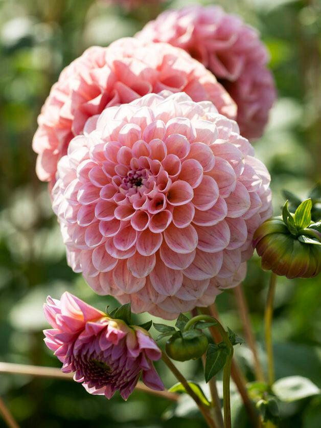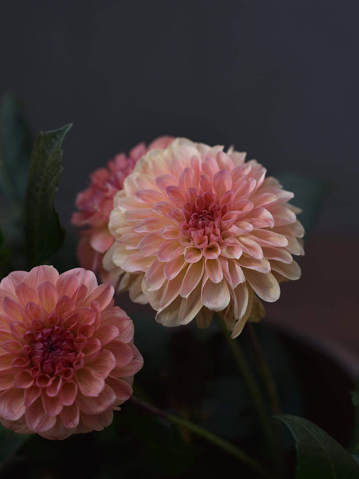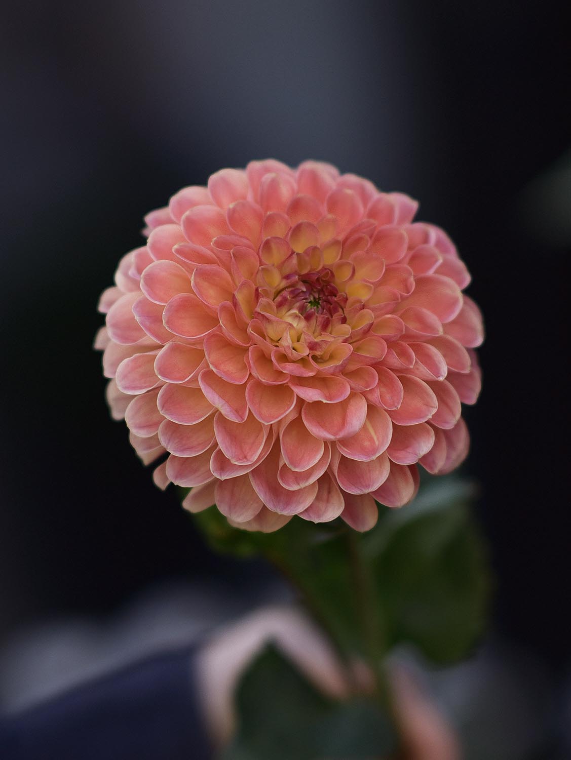 Dahlia 'Linda’s Baby’ a charming pompon dahlia with densely packed, rounded blooms measuring approximately 10 cm. The neatly rolled petals shift in shades from soft pink to apricot. Exceptionally long-lasting in a vase, making it a standout both in cut flower gardens and as a showpiece in borders.