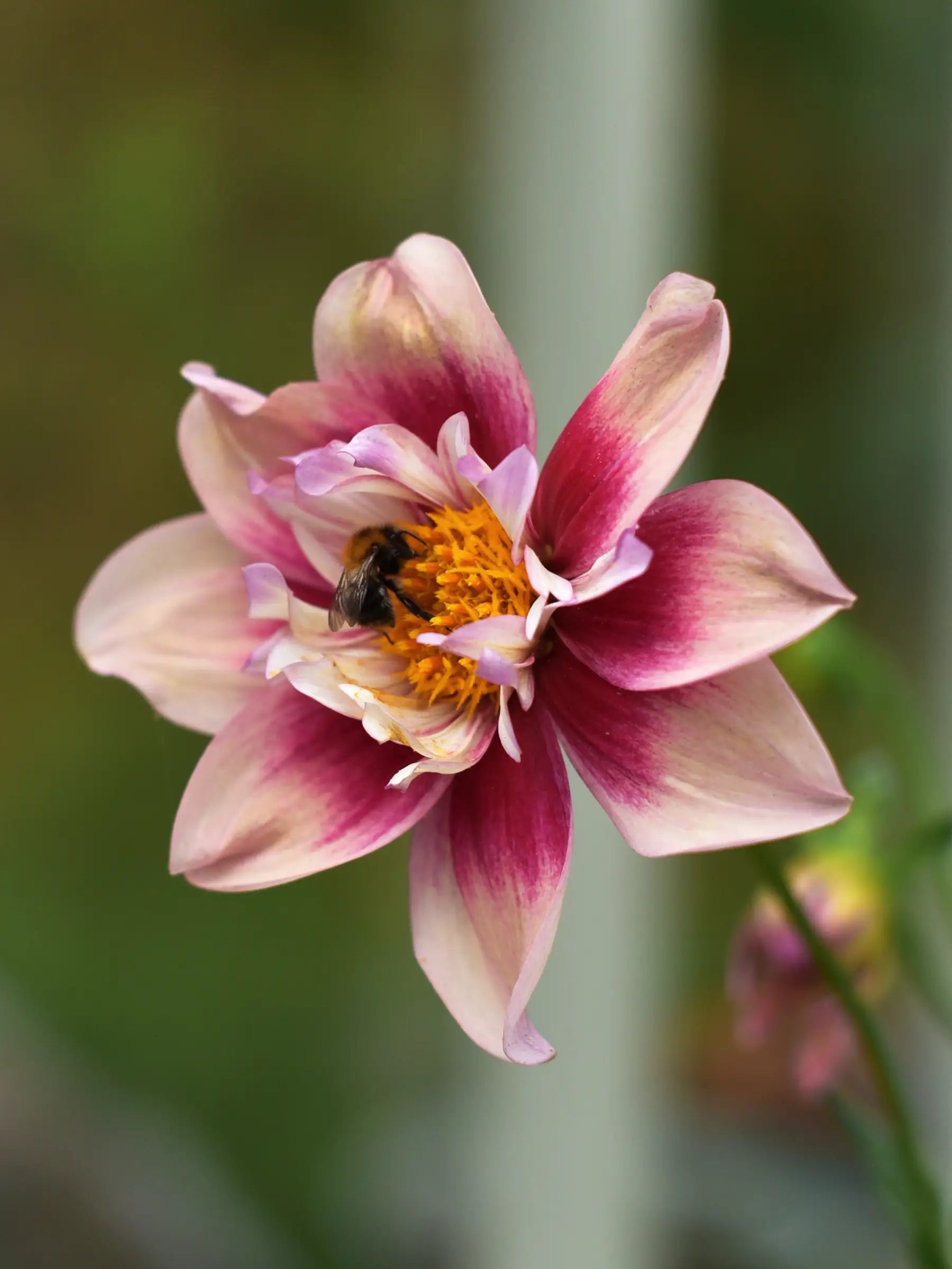 Dahlia ‘Rhubarb and Custard’ is a highly sought-after variety with a unique play of colour. Soft apricot petals contrast beautifully with a vivid cerise-pink centre and a playful frilled collar. The open flower form attracts butterflies and bees, bringing life to the garden. It blooms generously all summer and is a true jewel in borders, containers and bouquets.