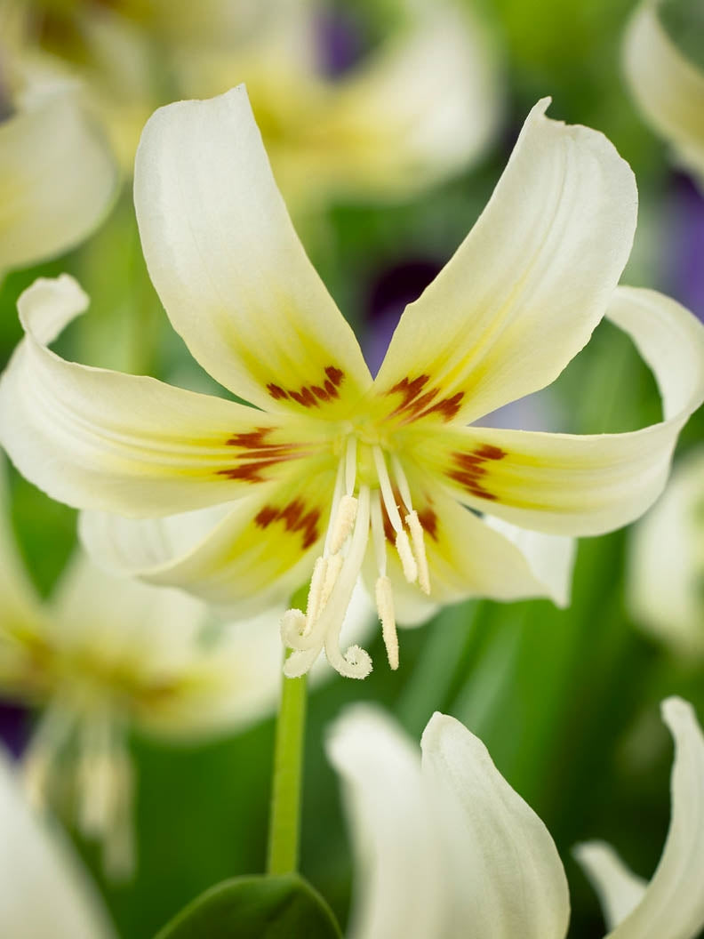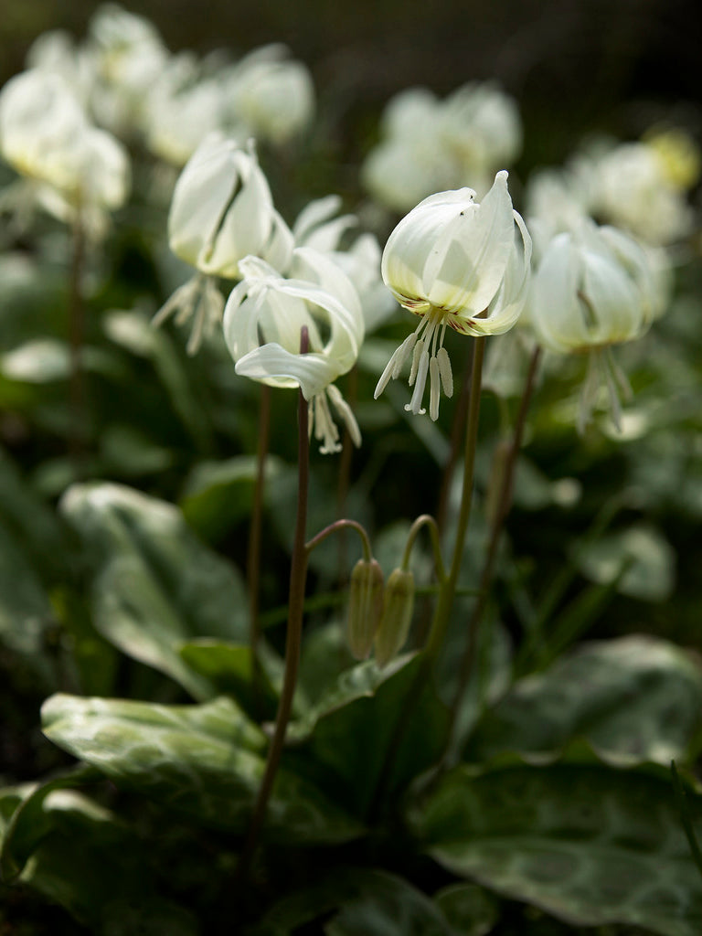 Erythronium 'White Beauty' features pure white flowers with yellow and brown accents. It is a classic variety for the garden and one of the easiest to grow. Blooms early in spring and reaches a height of 20-25 cm.