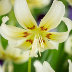 Plant 8–10 cm deep and about 10 cm apart in humus-rich, well-drained soil. Erythronium prefers partial shade and thrives under deciduous trees or in woodland-style plantings. Keep soil evenly moist, especially in spring. Let foliage die back naturally after bloom. Excellent for naturalizing and pairs well with other early spring bloomers like anemones and hepaticas. Avoid disturbing the bulbs once planted.