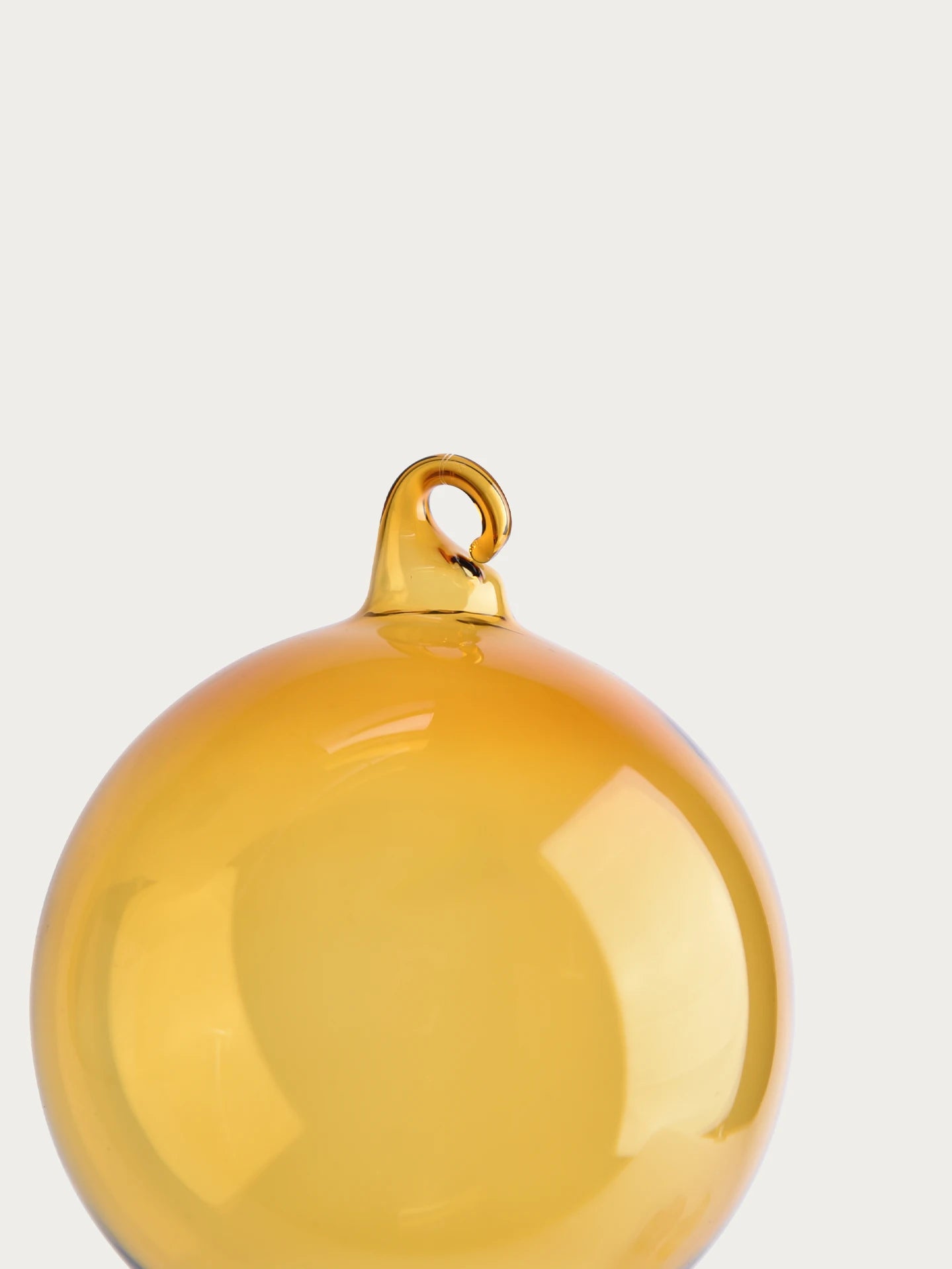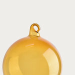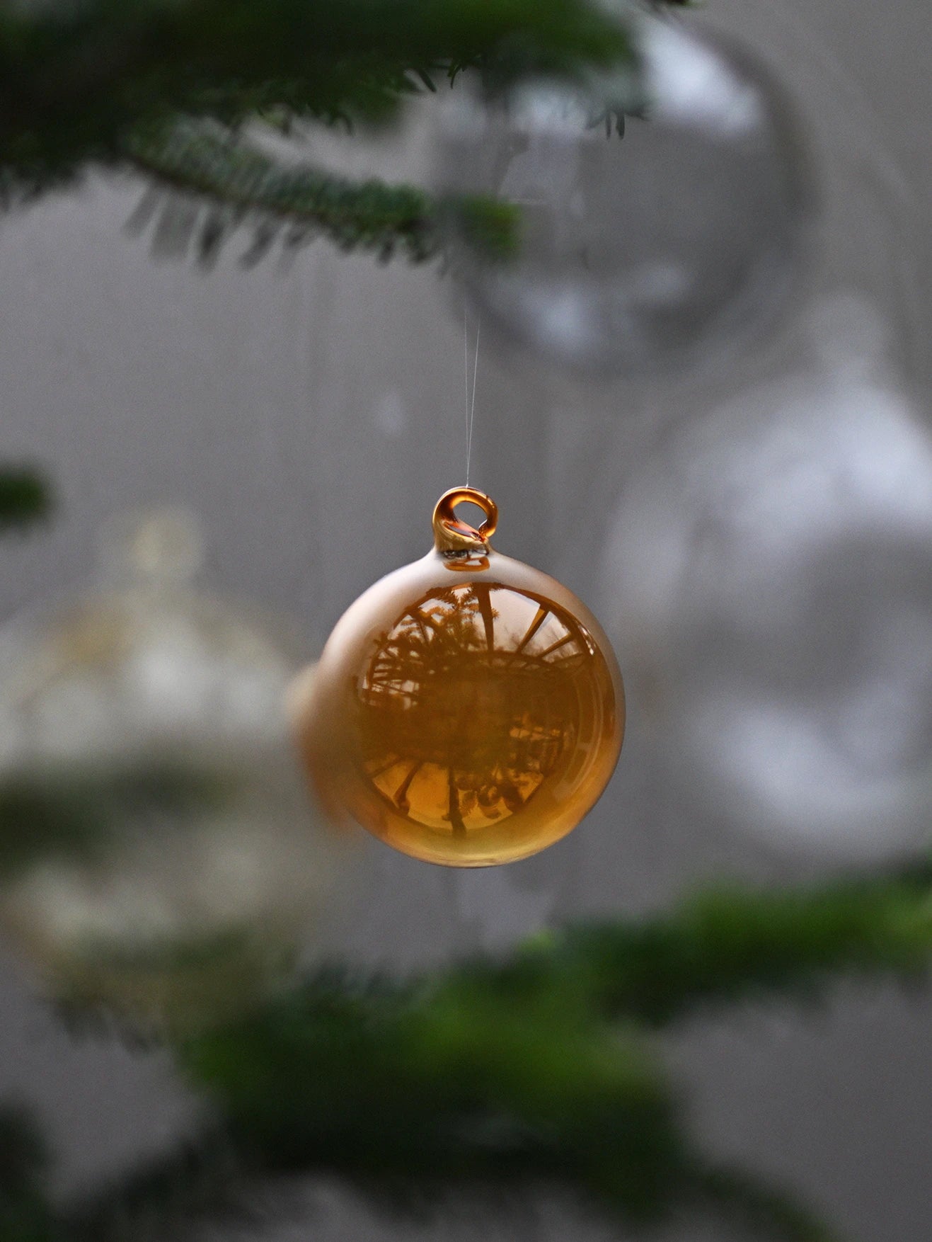 Handmade ‘Amber’ glass baubles in warm amber-coloured borosilicate glass with an integrated hanging loop. Each bauble is unique, showing small variations in the glass. The durable glass withstands sub-zero temperatures, making them just as beautiful outdoors as indoors. The thin, lightweight shape makes them elegant to hang in the Christmas tree or as window decorations.