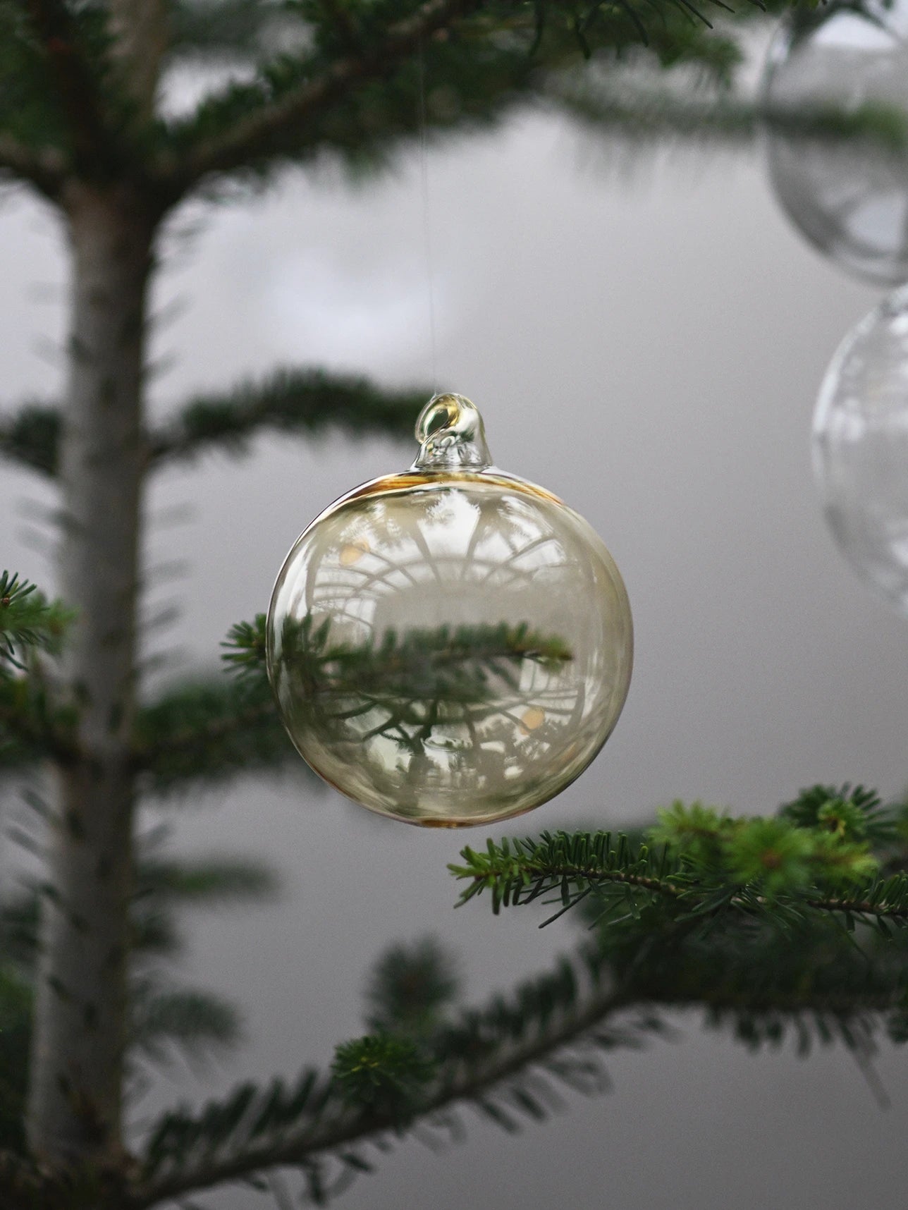 Handmade ‘Honey’ glass baubles in honey-coloured borosilicate glass with an integrated hanging loop. Each bauble is unique, showing small variations in the glass. The durable glass withstands sub-zero temperatures, making them suitable both outdoors and indoors. The thin, lightweight shape makes them elegant to hang in the Christmas tree or as window decorations.