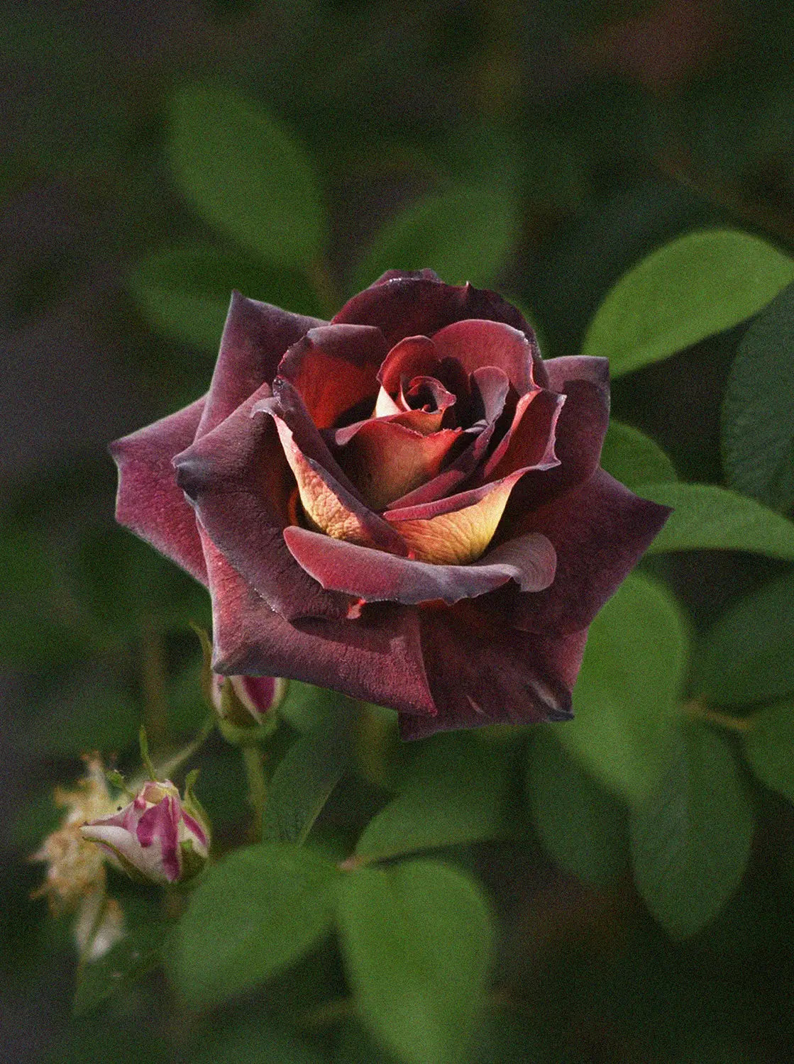 The hybrid tea rose 'Dark Night' is a highly spectacular rose with velvety red petals tinged with brown. The underside of the petals has a golden hue. This color is highly appreciated by many florists and is often used for festive table settings and bouquets. The color holds well even in strong sunlight. It has long stems with relatively large flowers and a mild fragrance. Stunning in bouquets alongside red dahlias, chocolate cosmos, and fragrant lilies.