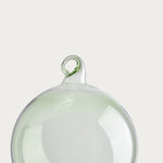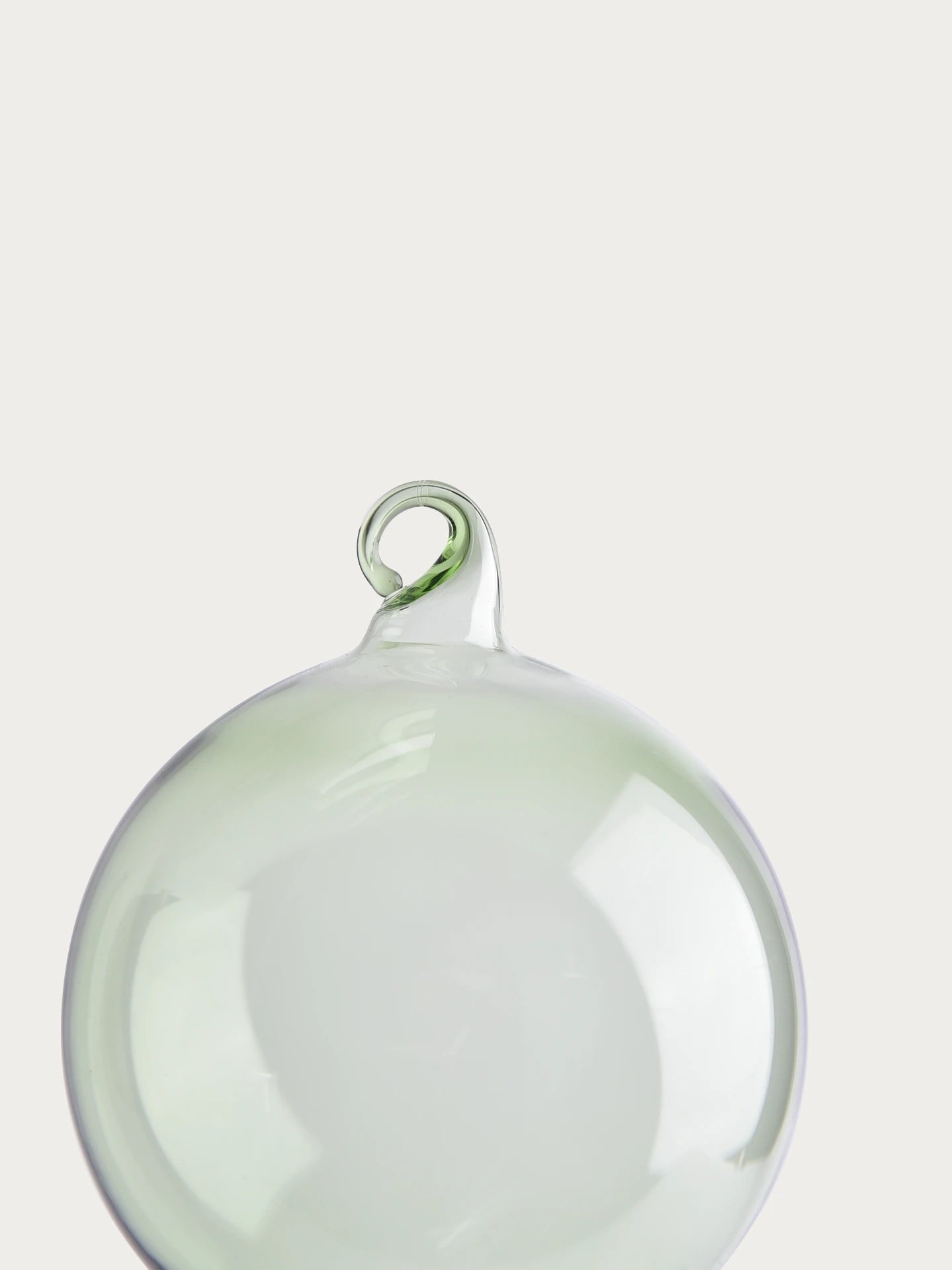 Handmade ‘Emerald’ glass baubles in green borosilicate glass with an integrated hanging loop. Each bauble is unique, showing small variations in the glass. The durable glass withstands sub-zero temperatures, making them suitable both outdoors and indoors. The thin, lightweight shape makes them elegant to hang in the Christmas tree or as window decorations.