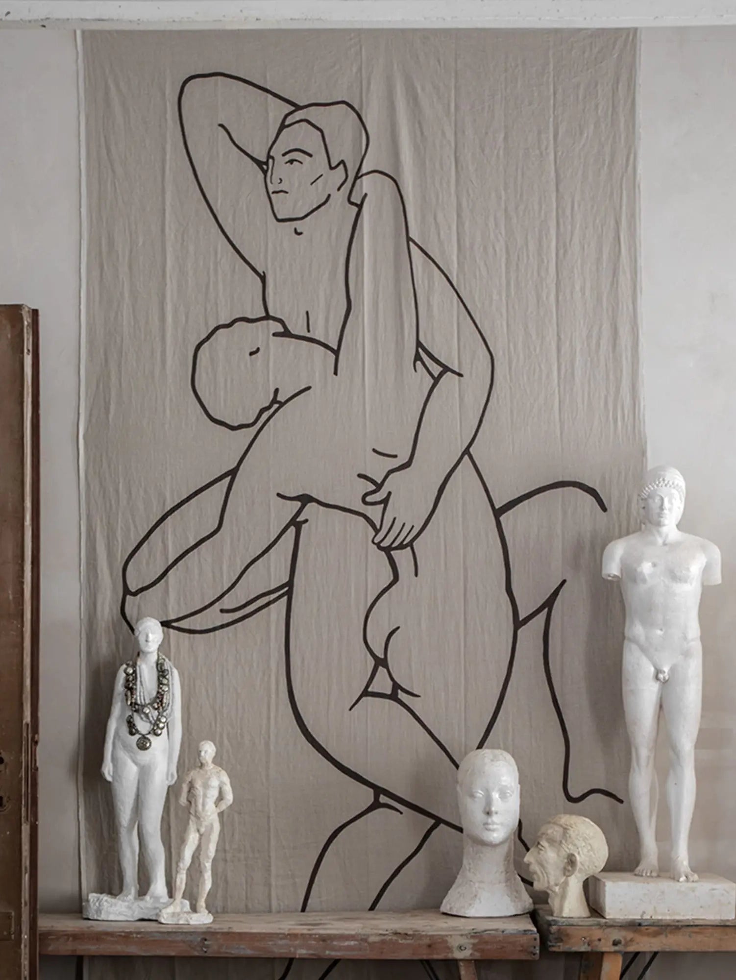 Linen Tablecloth Artwork WE Man + Man is an elegant and timeless tablecloth made of 100% washed linen with a graphic pattern. An expressive and inclusive artwork that works equally well as a tablecloth, bedspread, or wall hanging.