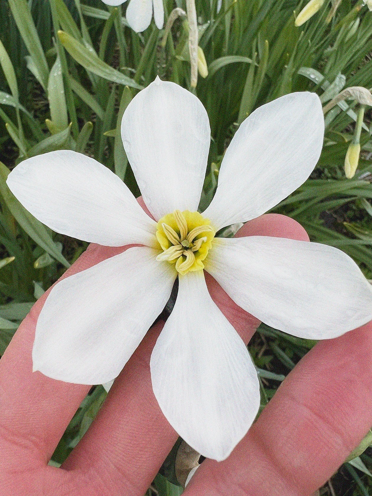 Daffodil 'Keats', Narcissus 'Keats' is one of the most unusual daffodils we have ever grown – and a variety that is rarely offered. This double-flowered daffodil grows to about 40 cm in height and blooms late in spring. The flowers feature narrow white outer petals and a small yellow cup enclosing six smaller white petals. What makes it truly unique are the slender, green-tinted petaloid segments that protrude from the cup – like tiny fingers, horns, or tentacles. A fascinating and playful detail that makes this variety so special!