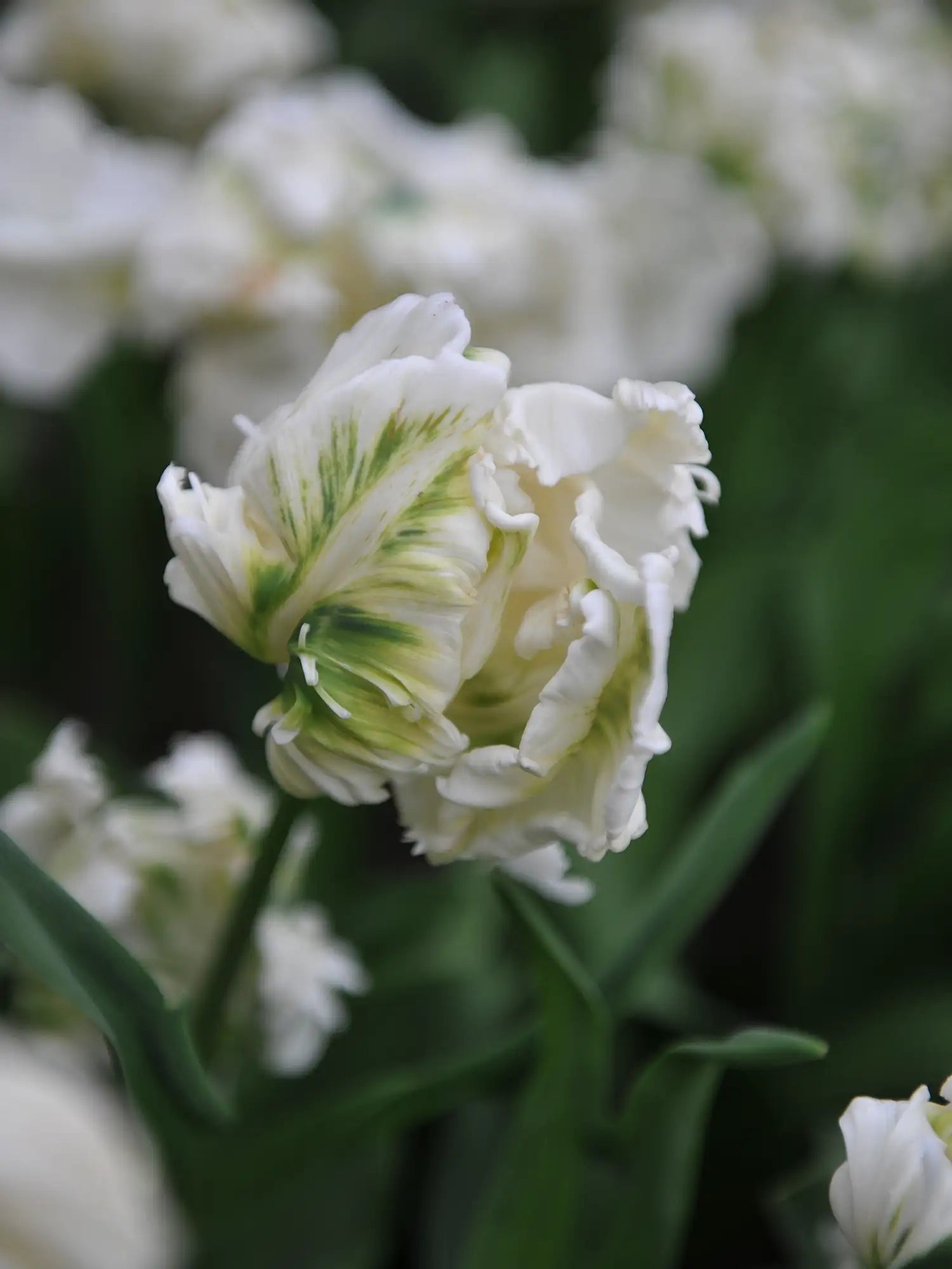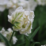 Tulip 'Super Parrot', Tulipa gesneriana 'Super Parrot' is a magnificent parrot tulip and an excellent replacement for the now-retired 'White Parrot'. It produces large, extravagantly ruffled white blooms with striking green feathering on the outer petals. A spectacular variety that truly stands out in both the garden and in arrangements.