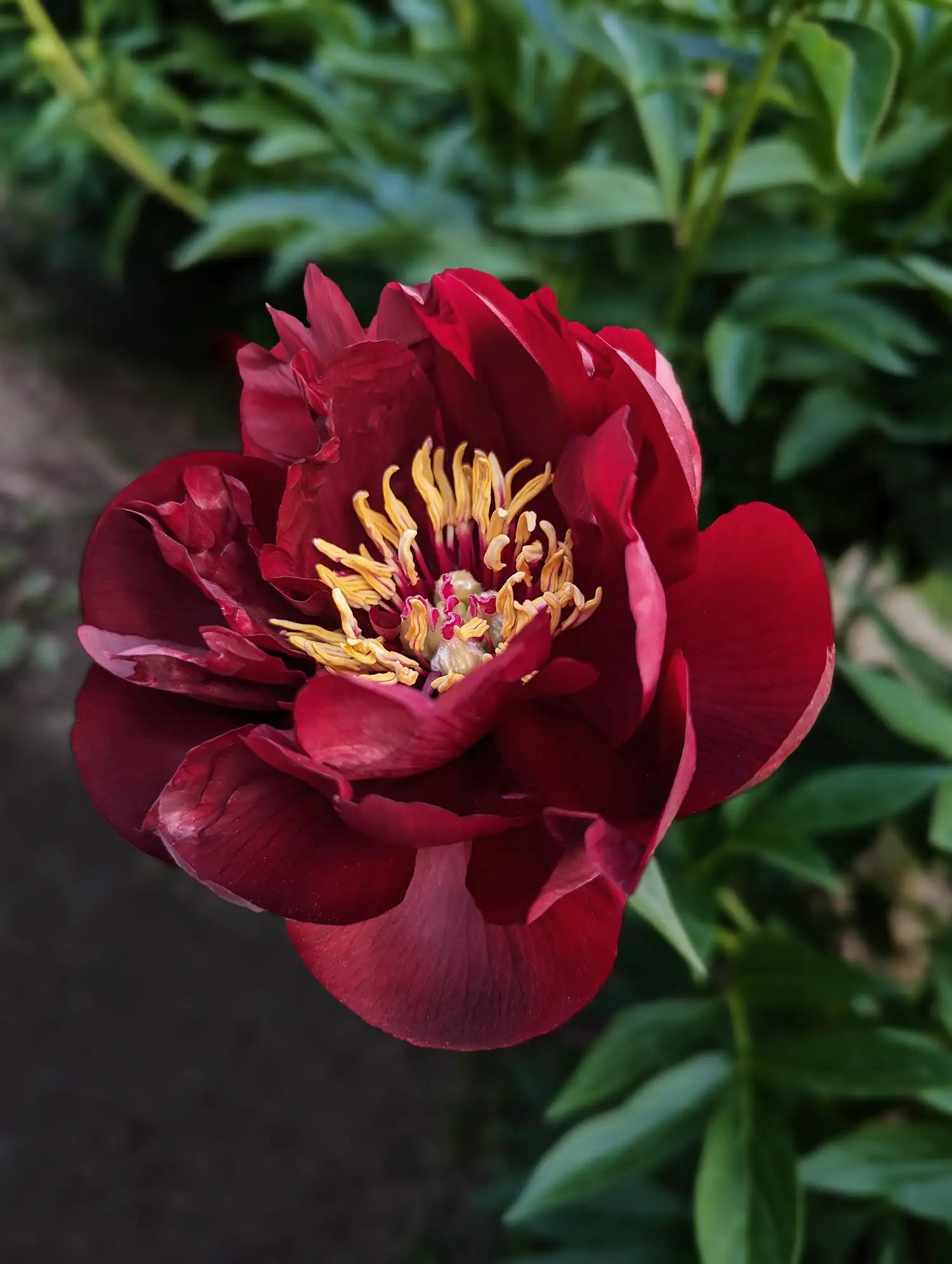 The foliage is dark green with slightly reddish stems, enhancing the rich bloom color. Its compact growth habit and vigorous performance make this variety ideal for borders and smaller garden spaces. ‘Buckeye Belle’ is highly regarded among collectors and peony enthusiasts, known for its strength and reliable flowering year after year.