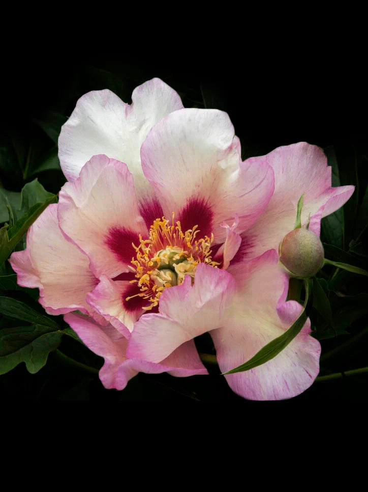 Paeonia Itoh hybrid 'Callie’s Memory' produces beautiful semi-double flowers in a soft peach color that gradually fades to creamy white as they open, revealing a burgundy-red center. A lovely detail is the matte pink hue that appears along the petal edges.