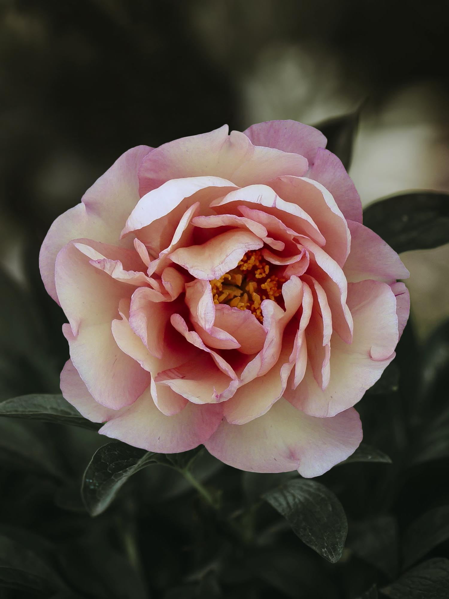 Paeonia Itoh 'Magical Mystery Tour' produces semi-double flowers that resemble roses. The color transforms as the bloom develops, shifting from pinkish-orange-red to a soft vanilla yellow with lavender-pink edges.