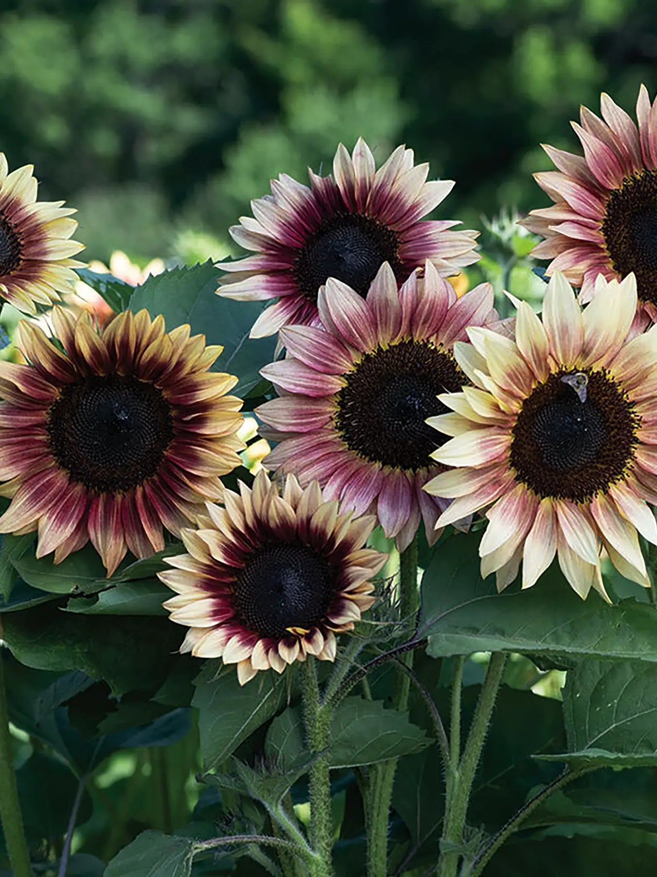 This stunning sunflower grow to a hight of 150-180 cm. They are known for their branching stems and big blooms, up to 12-15 cm across, with burgundy, pink and ivory-tipped petals surrounding a dark center. Attractive to bees and butterflies. Easy to grow and sensational at the back of a sunny border. Both buds and flowers are edible.