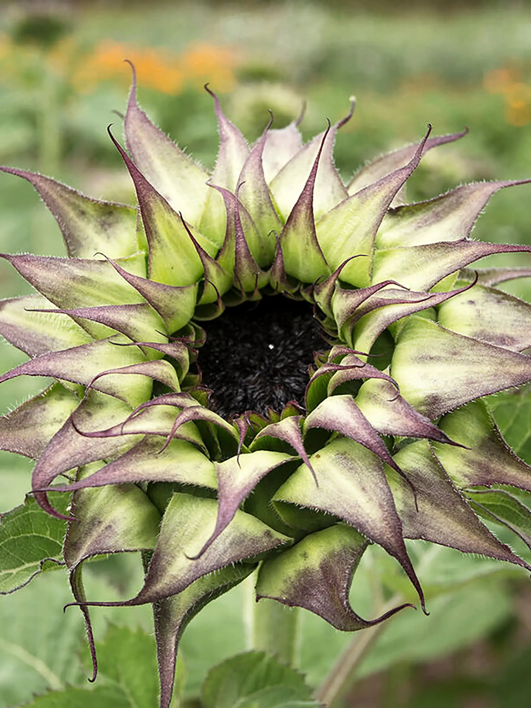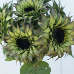 These fast growing sunflowers produce sturdy 10 cm bright green flower heads and are ideally used as pree-bloom cut stem for bouquets greenery. Steams are cut when buds expand and before petals are appear. Petals are green at the center fading to purple at the tips.