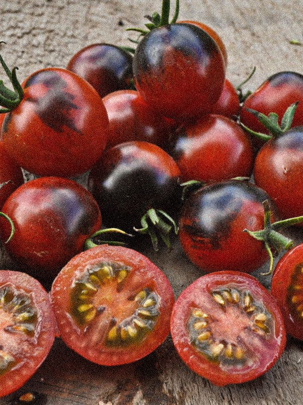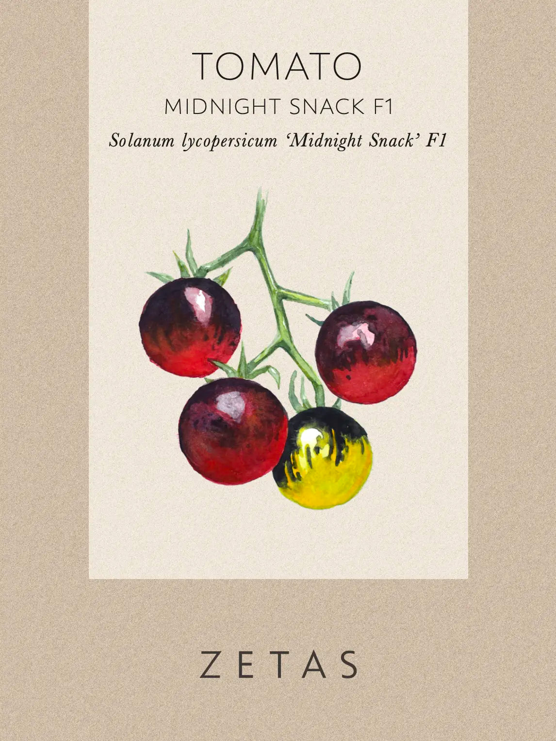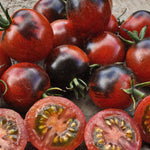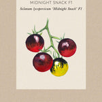 Tomato 'Midnight Snack' is a variety that ripens to red with beautiful glossy black-purple coating when exposed to sunlight. Good in salads or pick and eat directly. Weight: about 15 grams. Organic seeds.