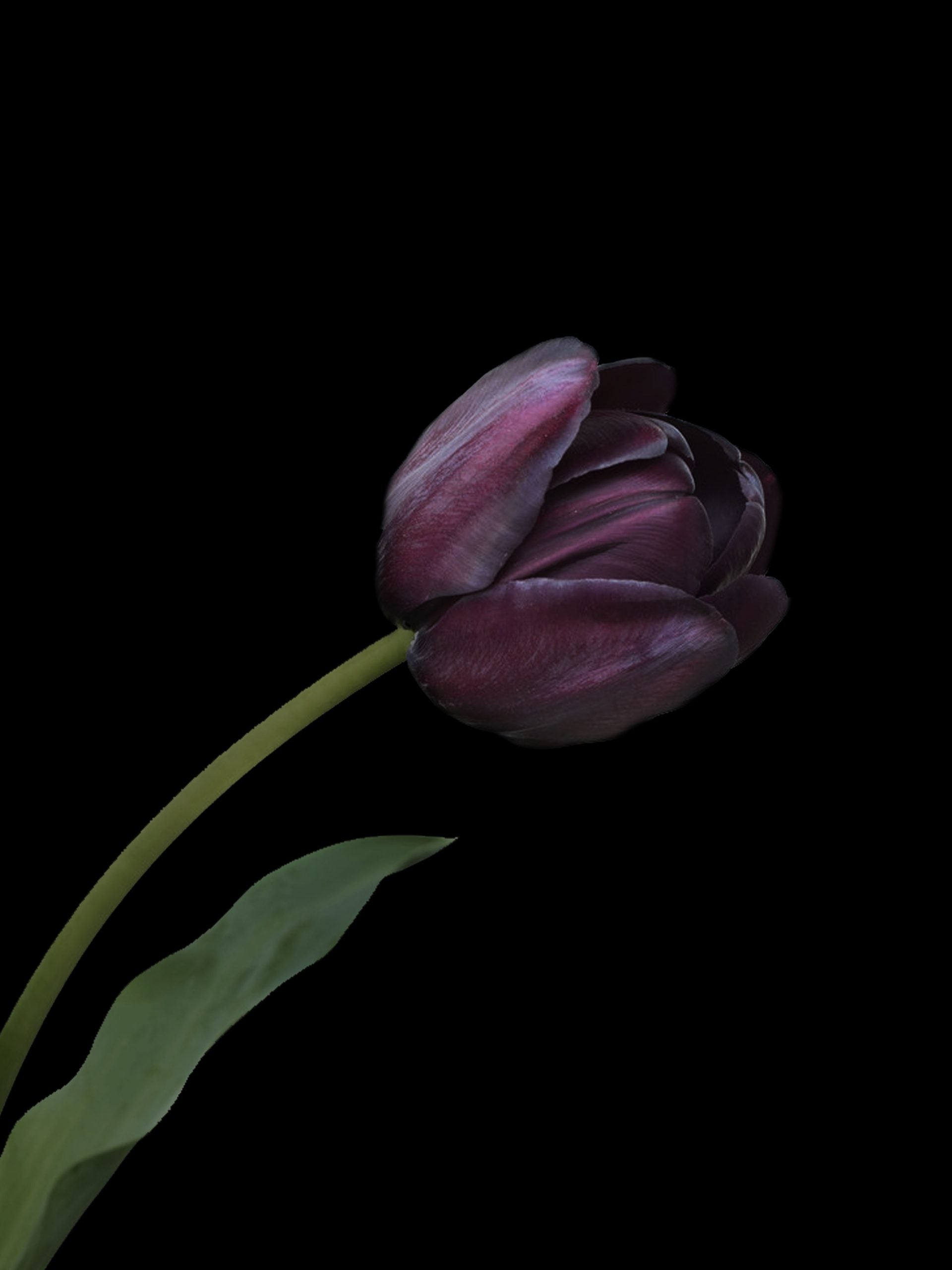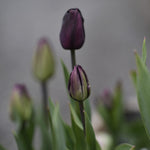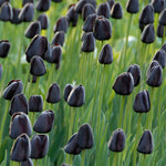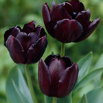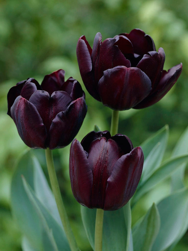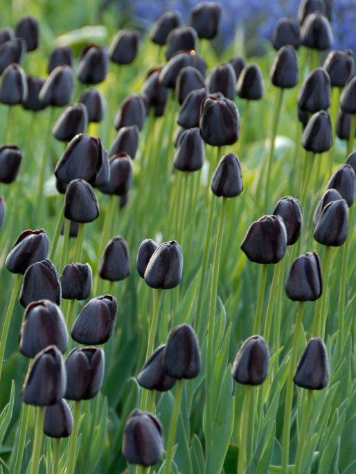 Tulip 'Queen of Night' is a deep velvety violet, egg-shaped tulip with a beautiful black sheen. It has a gray-green stem with matching foliage. In May, it reaches a height of around 55 cm and offers a long-lasting bloom.