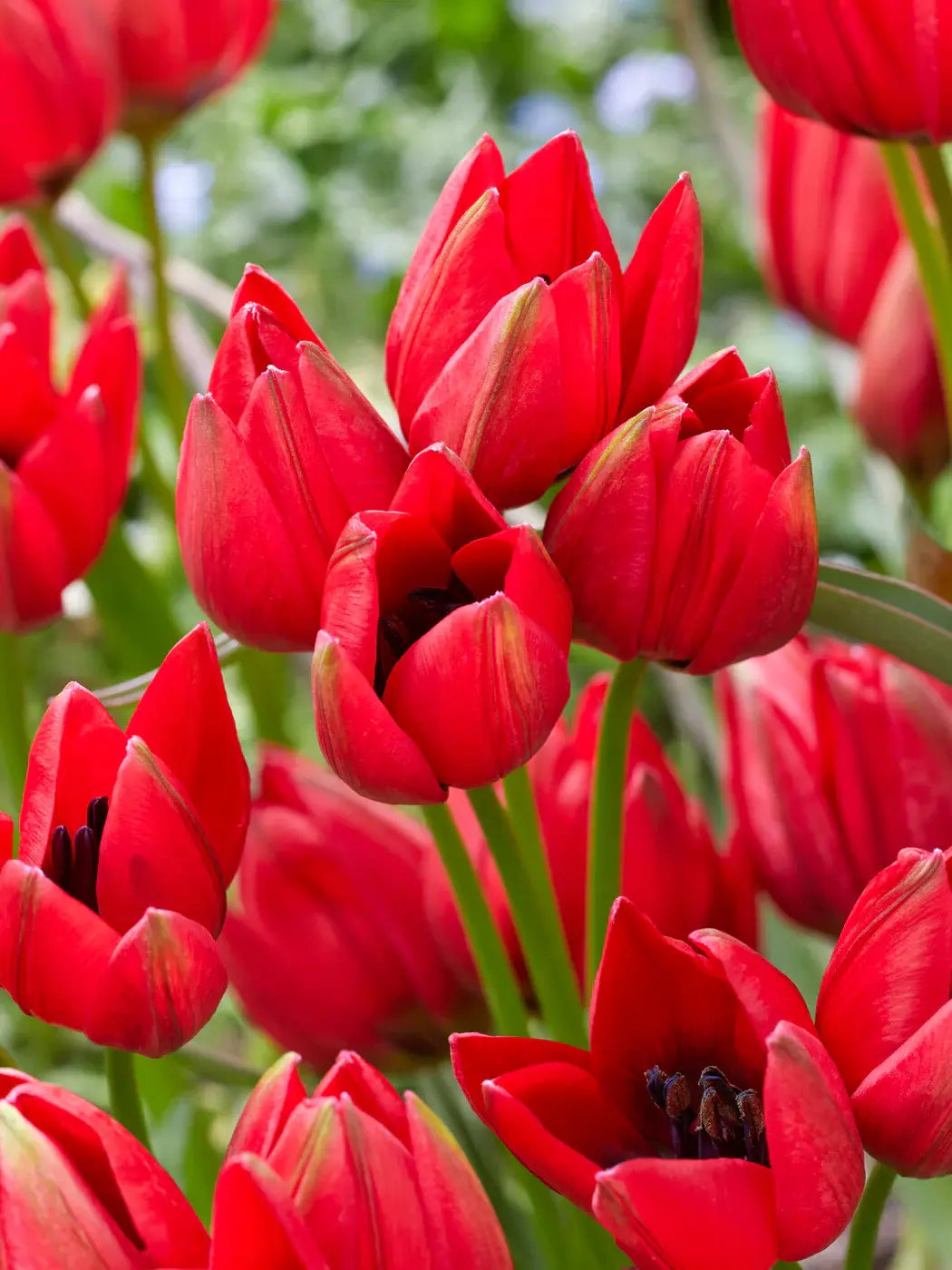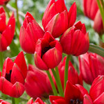 Tulip 'Francisca', Tulipa 'Francisca' is a true burst of color. This dwarf variety grows to about 15 cm and produces several bright scarlet-red blooms that open in the sunshine to reveal deep aubergine centers – a dramatic contrast that truly catches the eye.