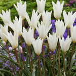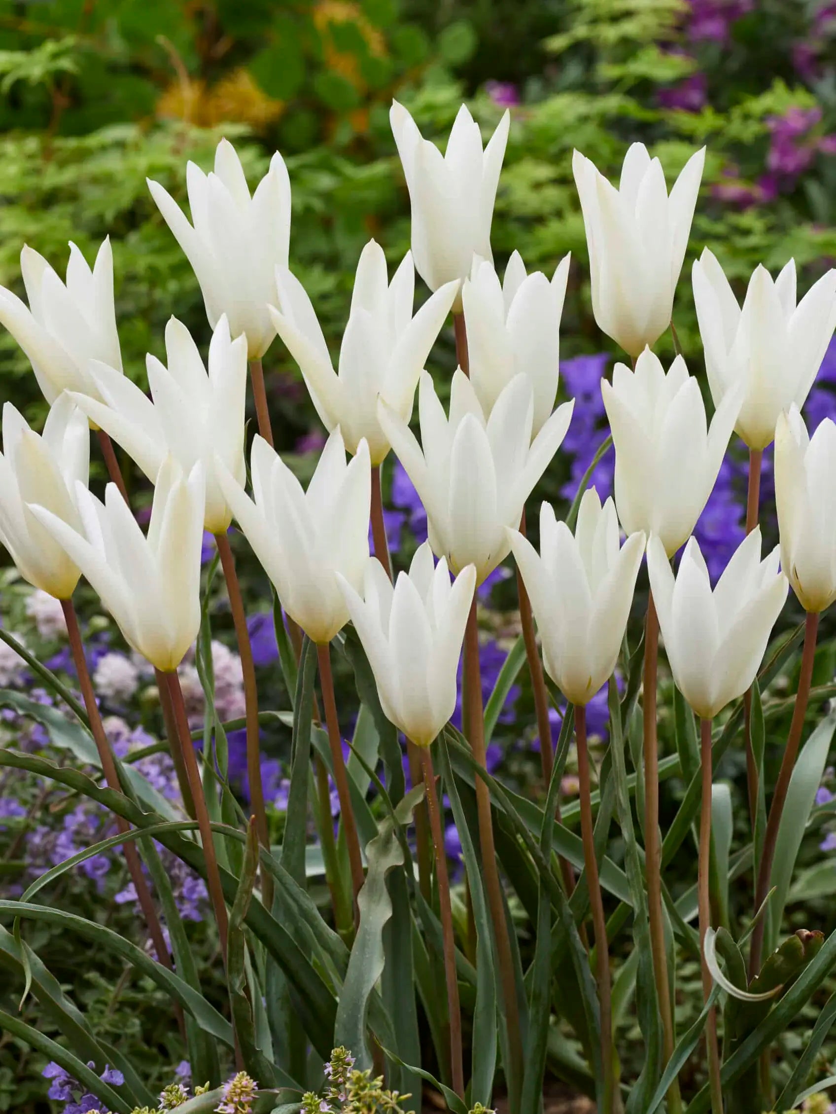 Tulip 'Sylvia', Tulipa 'Sylvia' is a new clusiana variety with pure white petals, a soft yellow base, and elegant garnet-red stems. An unusual and highly prized botanical tulip that brings a fresh and refined look to both borders and pots.