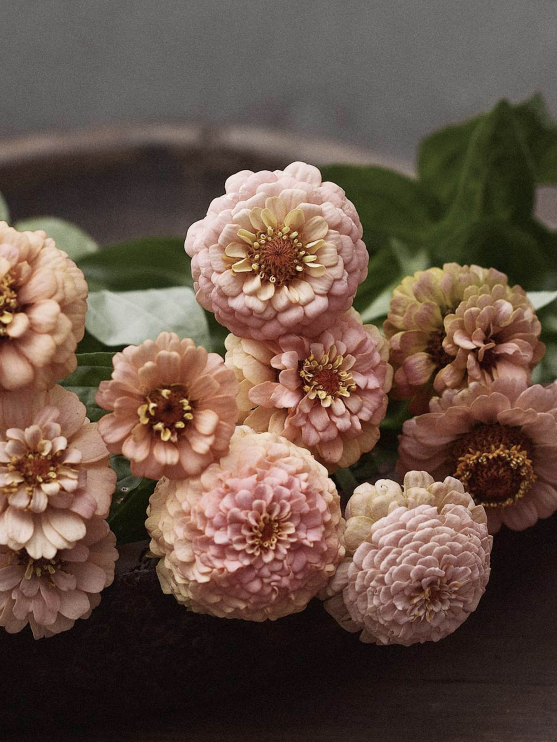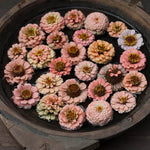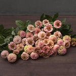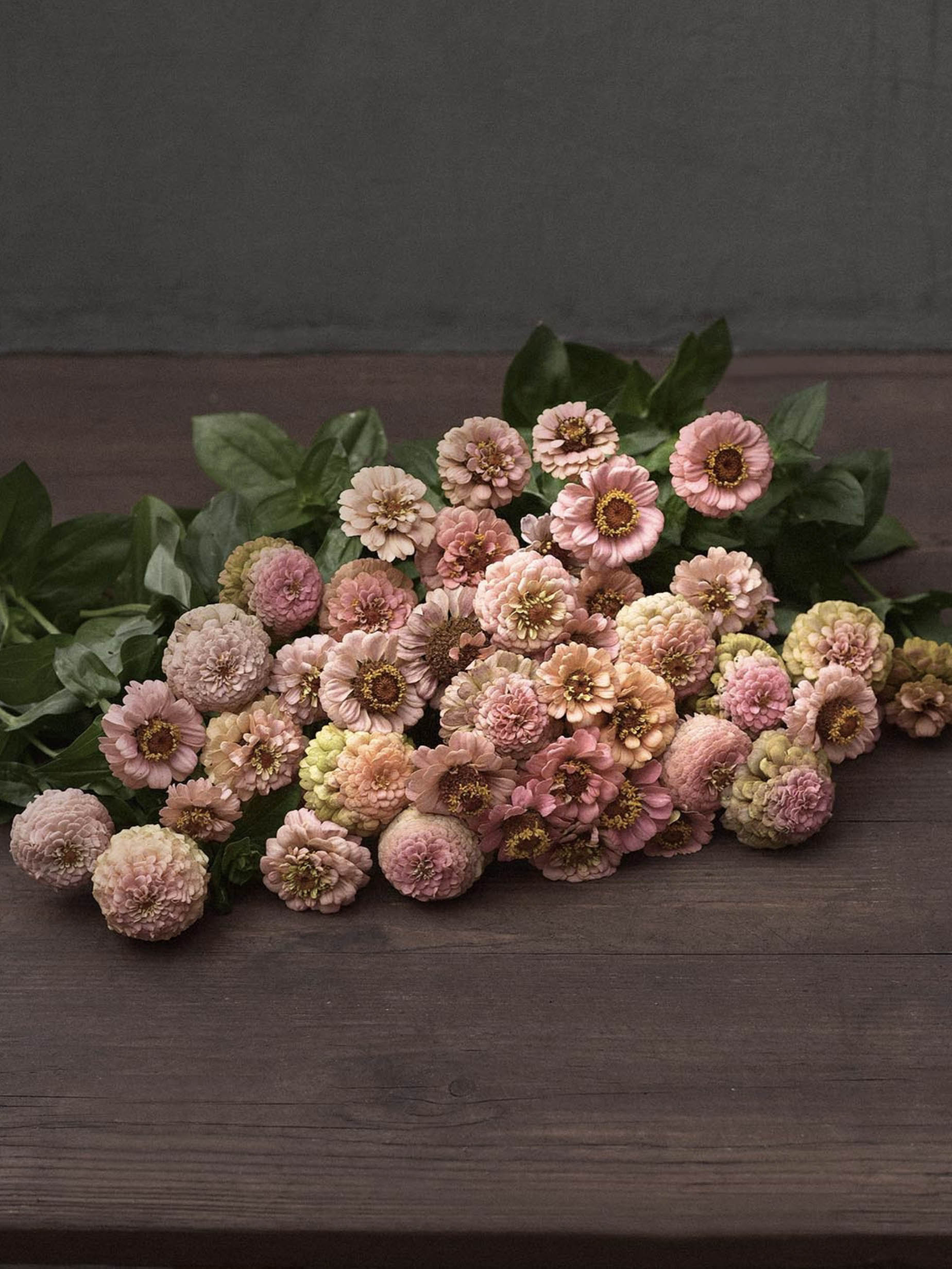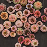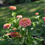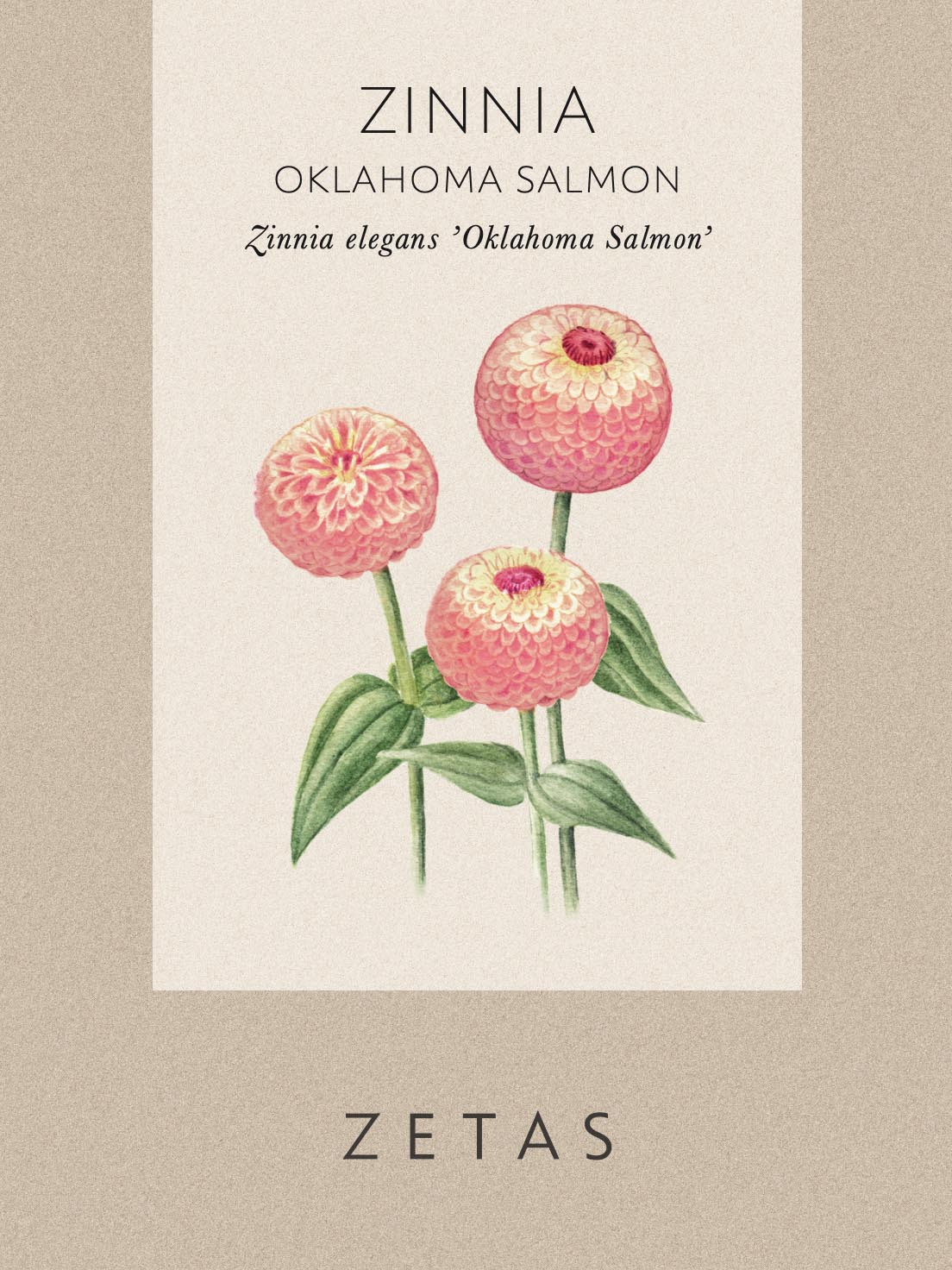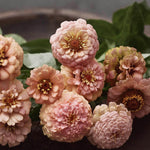 Zinnia 'Oklahoma Salmon' is chosen for its excellent color, form, and blooming traits. It produces double flowers in a mix of salmon and apricot pink shades. The flowers are relatively small but abundant, especially when regularly harvested. With sturdy stems, it's the perfect cut flower for seasonal mixed bouquets.